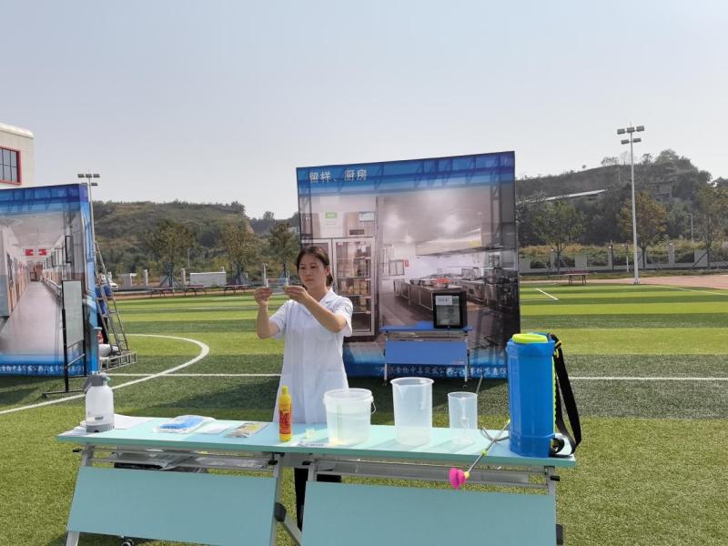 消毒人员根据流调情况,确定学校食堂、学生呕吐物污染的场所为重点消毒对象,开展消毒液配制和终末消毒。