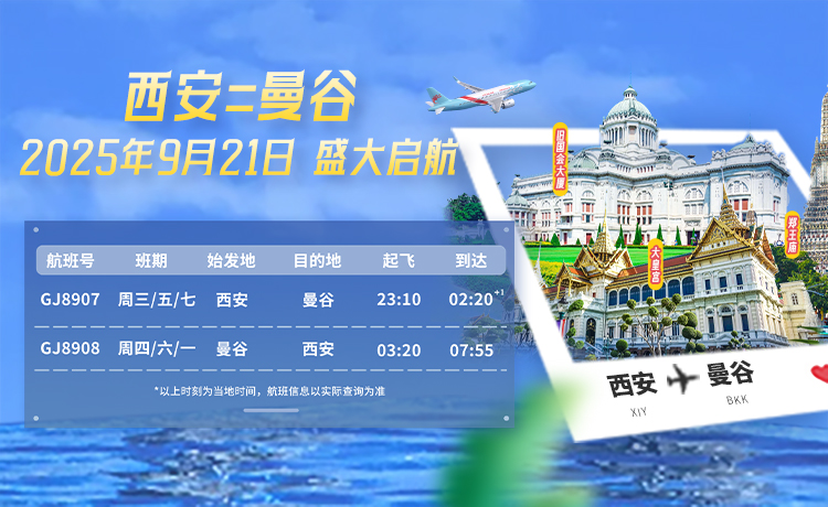 西安-曼谷航线,往返航班号GJ8907/GJ8908,每周三、五、日执飞。