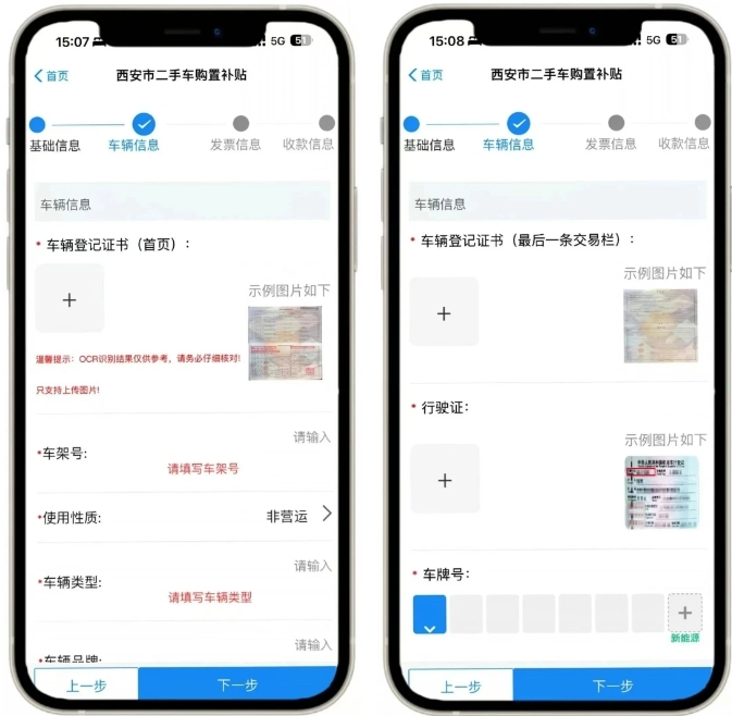 1.请上传机动车登记证书(主页正面车辆信息、副页档案信息以及登记栏车辆转让信息)图片和行驶证(主页正面车辆信息)图片,系统将自动识别并回填相关信息。