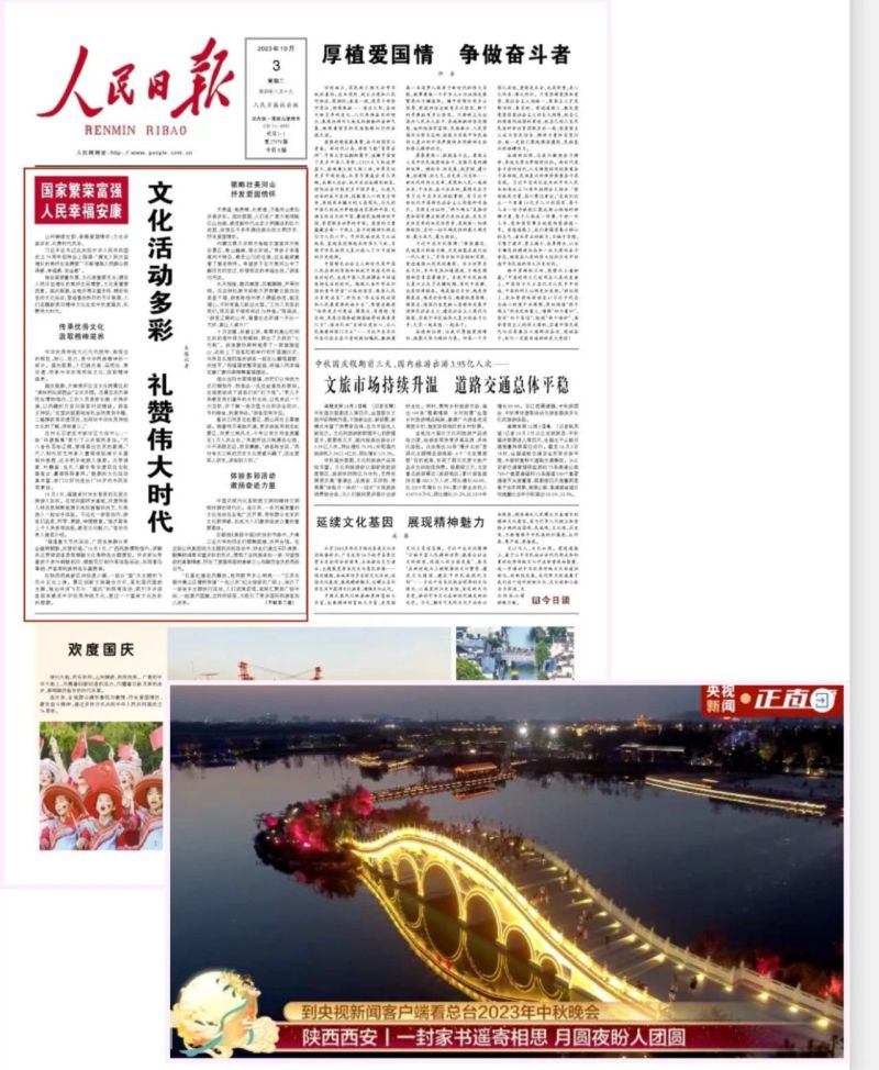央视新闻在沣东新城昆明池·七夕公园直播26分钟,通过民俗讲解、传统祭月、鹊桥诗会、巡游祈福等活动,重温传统习俗,体验古代中秋节的热闹景象;《人民日报》10月3日头版报道沣东新城诗经里小镇,创新文旅融合方式,紧扣国风国韵主题,吸引众多游客前来感受中华优秀传统文化;陕西广播电视台、西安广播电视台等多家省市主流媒体持续关注。沣东新城中秋十一假期文旅活动热力十足。