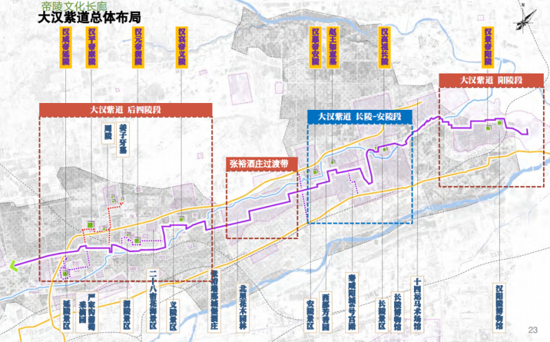 秦汉新城“大汉紫道”帝陵文化长廊项目,分为后四陵组团、张裕城堡过渡带、长陵-安陵组团、阳陵组团4个板块,将按照历史发展脉络,严格遵守文物和永久基本农田保护要求,以环境整治和景观提升为主,通过分级实施道路提升改造,设置综合性服务驿站和露营房车营地等方式,打造沉浸式品味历史文化、体验式感受自然之美、交互式带动活力村庄的多元特色廊道,展现“山-水-原-城-陵”格局和大遗址景观之美。