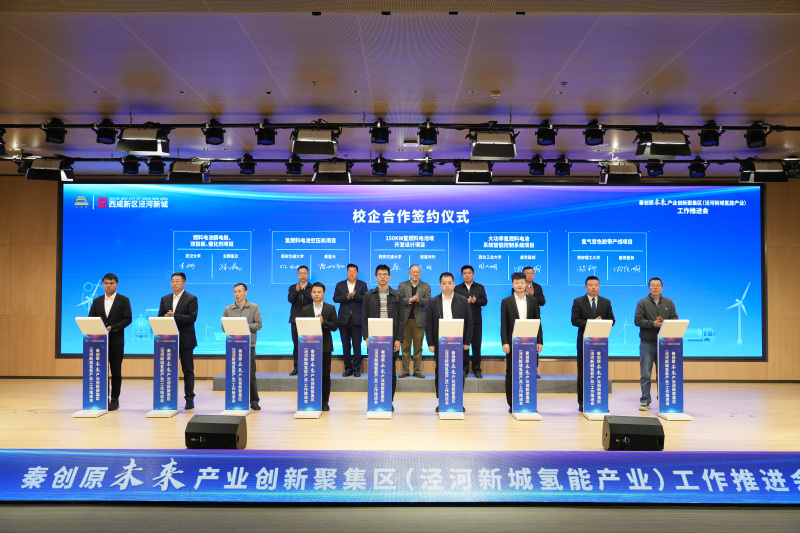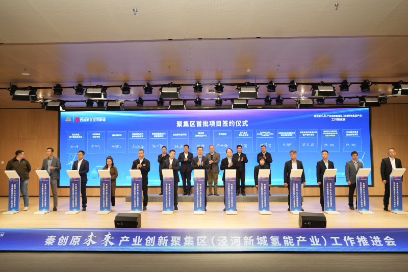 推进会现场还举行了签约仪式。1GW梯次电池综合利用项目、压缩机产业研究院(90兆帕压缩机研发)及生产线、绿氢及高性能催化剂国产替代项目、车载供氢系统暨超四代高压储氢瓶项目、氢晨能源西北区域研发运营中心及燃料电池电堆生产制造项目、空气悬浮鼓风机项目、氢能膜电极项目(云腾氢芯)、阻隔材质超四代储氢瓶项目、单晶硅电池片辅助材料项目、核孔膜项目、新型硅碳负极项目、低温液氢透平膨胀机等12个项目;氢气变色胶带产线项目,大功率氢燃料电池智能控制系统项目,150KW氢燃料电池堆开发设计项目,氢燃料电池空压机项目,燃料电池膜电极、双极板、催化剂项目等5个校企项目;1个氢能研究院项目正式签约,落地泾河新城。