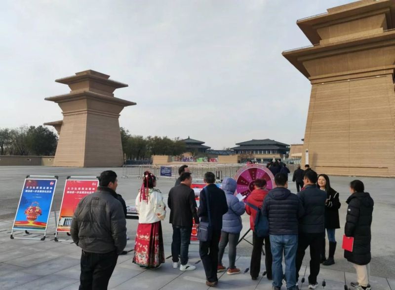 在秦汉新城新晋“顶流”——陕西历史博物馆秦汉馆南广场,新城依法治区办工作人员向游客宣传相关法律法规,引导大家树立法治观念,增强法律意识,自觉遵守法律法规。