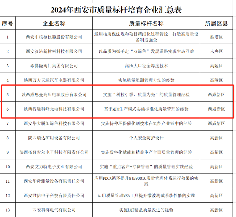 近日,西安市工业和信息化局公布2024年西安市质量标杆培育企业名单,32家企业入选,其中,沣西新城2家企业登上榜单。