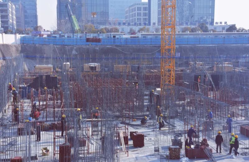 人勤春来早,建设正当时。铂樾万境中心(北区)项目施工现场,大型机械来回吊装材料,近百名工人正在负二层开展施工作业。