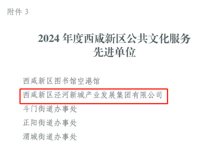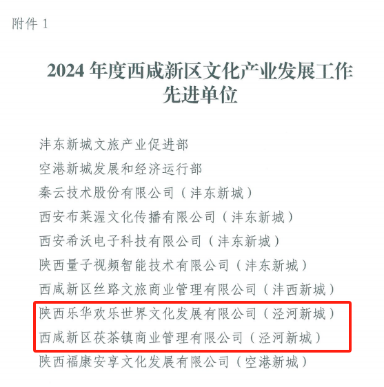 近日,陕西乐华欢乐世界文化发展有限公司和西咸新区茯茶镇商业管理有限公司同时获评2024年度西咸新区文化产业发展工作先进单位;西咸新区泾河新城产业发展集团有限公司获评2024年度西咸新区公共文化服务先进单位