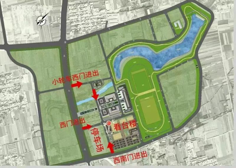 导航至秦汉国际马术中心,可由西门、西南门或小轮车西门进出。由西南门入场的车辆停放在停车场内,西门或小轮车西门入场的车辆跟随工作人员指引有序停放。