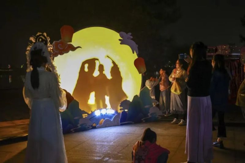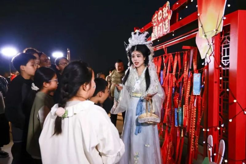 猜灯谜环节则充满了欢声笑语。一盏盏灯笼下,悬挂着各式各样的谜题,游客们或踮脚念题,或低头沉思,答对时的欢呼与领到小礼品的喜悦,让这个中秋夜更加热闹非凡。