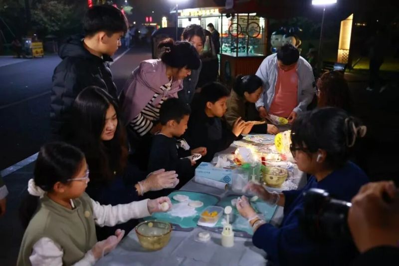 长桌旁,家长与孩子围坐一圈,揉面团、捏月饼,每一个动作都饱含着耐心与爱意。风中轻摇的灯笼,似乎也在为这份浓浓的亲子情增添几分暖意。