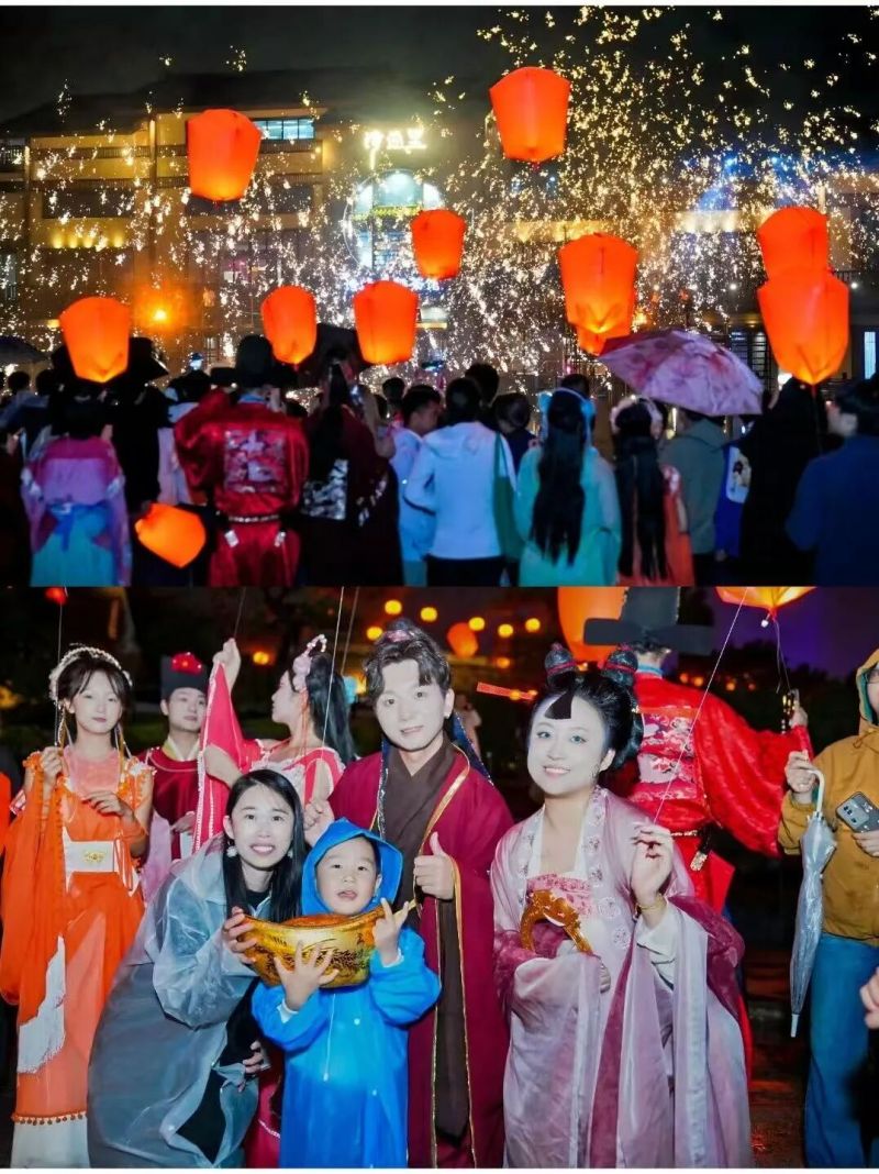 “天女散花”环节则带来了满满的中秋浪漫。身着仙裙的演员从天而降,手撒粉白花瓣,花瓣轻轻掠过圆月,落在游客肩头,仿佛是月宫仙子向人间传递着祝福。现场充满了温柔的笑意,人们或伸手接花,或对着月亮许愿,共同编织着关于团圆的梦想。