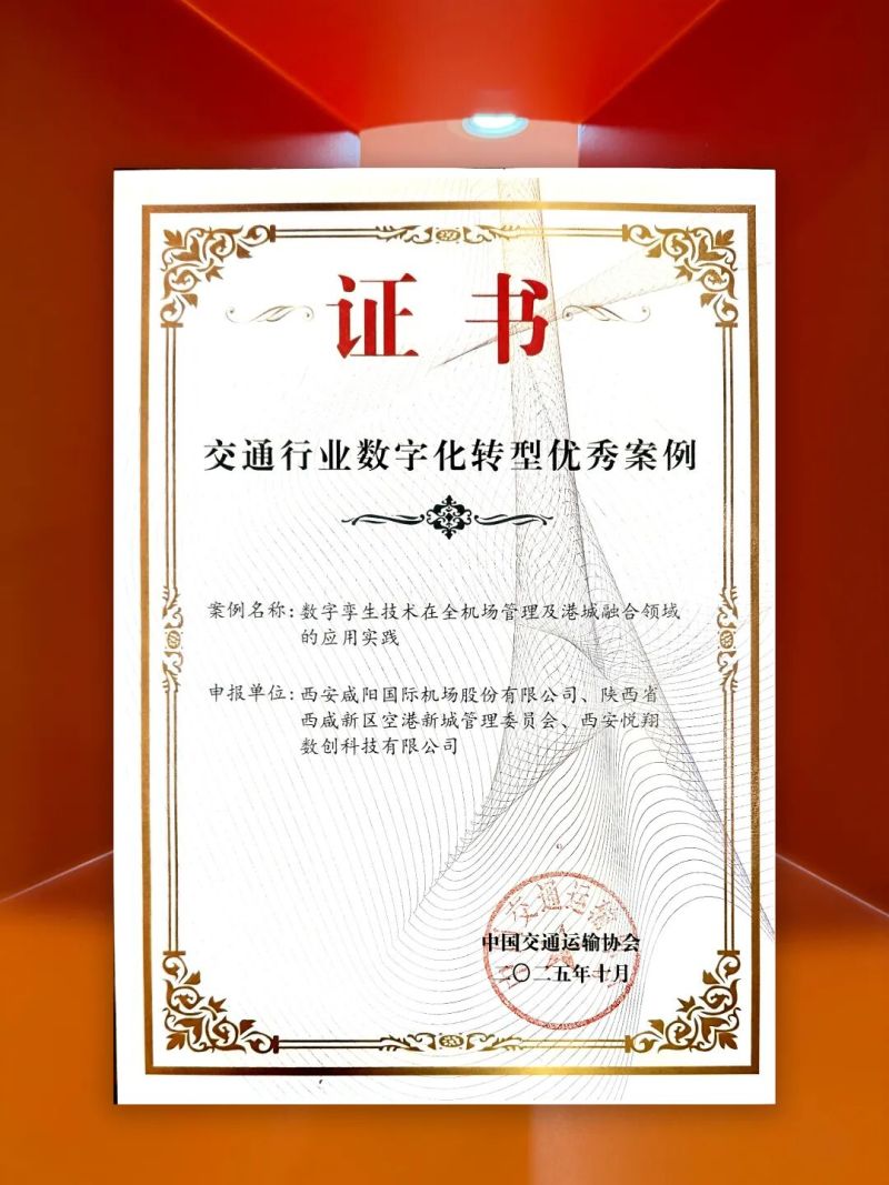 近日,第三届中国数智交通创新发展大会在成都举行。大会发布了交通行业数字化转型优秀案例,由空港新城与西安咸阳国际机场股份有限公司、西安悦翔数创科技有限公司联合申报的“数字孪生技术在全机场管理及港城融合领域的应用实践”案例成功入选。