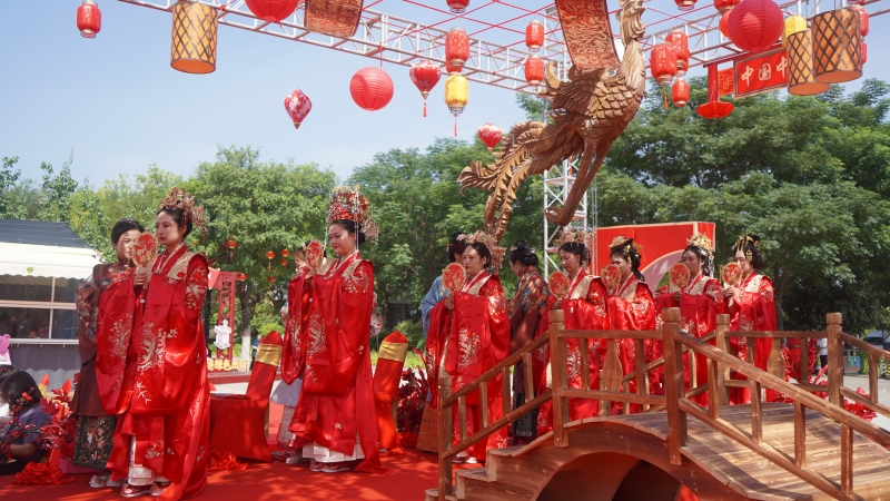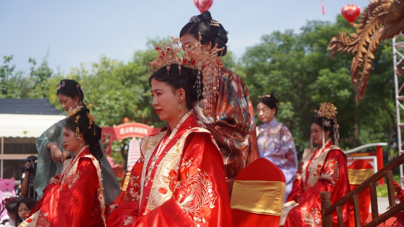 崇文古塔,处处流淌着古风遗韵弥漫着浪漫气息。当天正午,身穿红色明制中式礼服的新人们缓缓步入会场中央,进行了执出阁礼、沃盥礼、同牢礼、合卺礼、结发礼、对拜礼等仪式,共同携手许下爱的诺言。在庄重不失活泼的中式浪漫氛围中,七对新人从此开启人生新篇章,共同创造美好幸福的明天。
